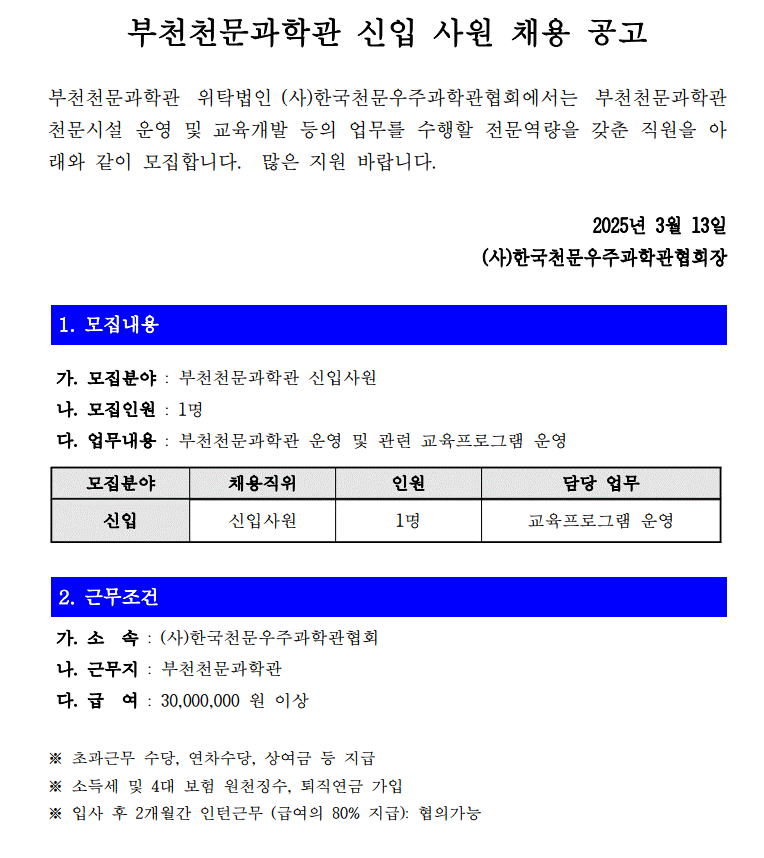2025년 부천천문과학관 신입 사원 채용 공고