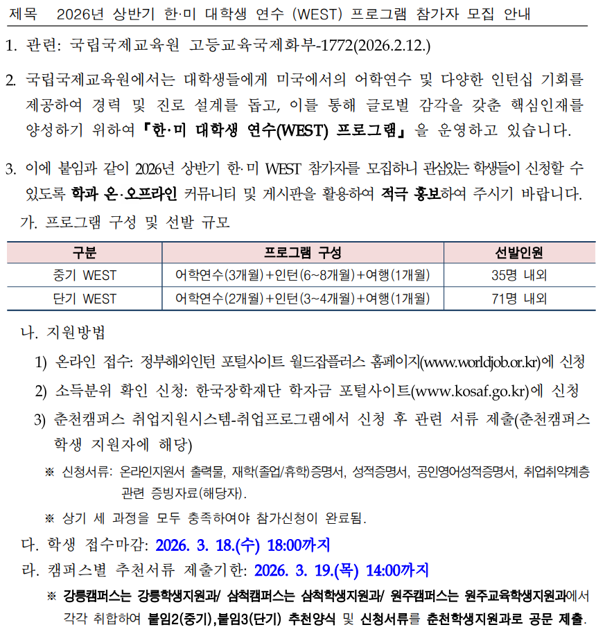 2026년 상반기 한·미 대학생 연수 (WEST) 프로그램 참가자 모집 안내