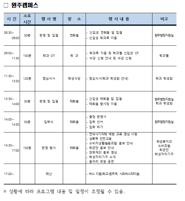 2026학년도 신입생 입학식 OT 프로그램 일정