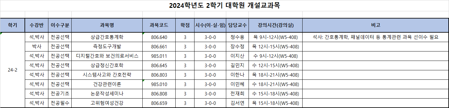 * 변경사항: [상급간호통계학] 과목은 석,박사 수강이 가능하며 석사의 경우 간호통계학, 패널데이터 등 통계관련 과목을 선이수한 자만 가능합니다.