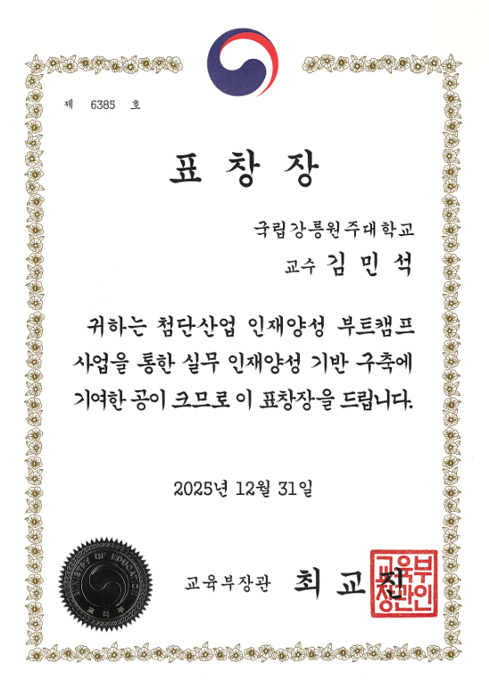 87 김민석 교수, 교육부장관 유공 표창 수상(2025년 12월31일) 송두석 2026.02.13 216 0