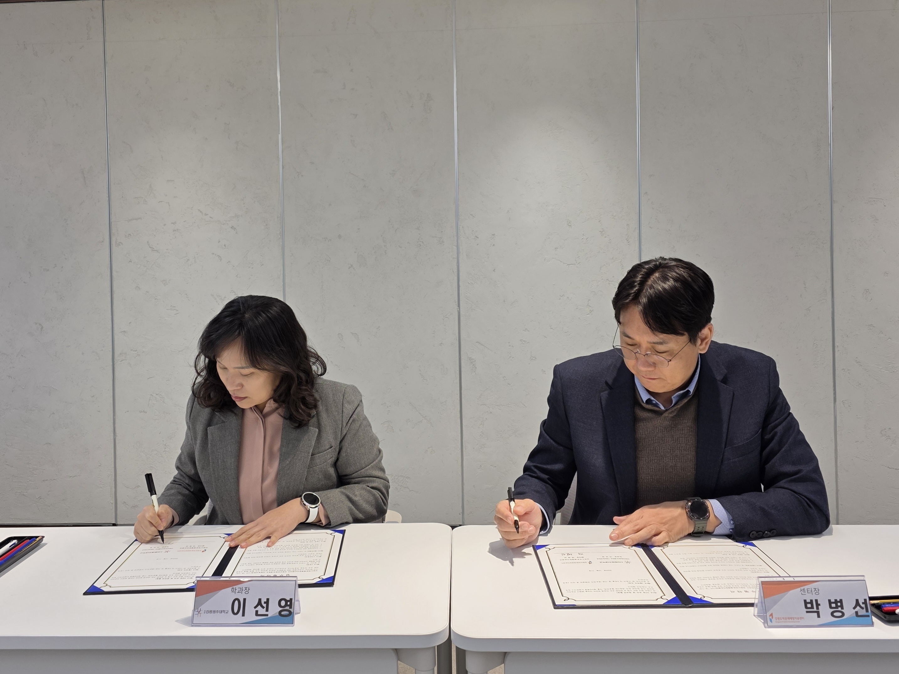 사회복지학과(학과장 이선영)와 강원도박문제예방치유센터(센터장 박병선)는 도박문제에 대한 학생들의 전문성 향상과 상호 협력 체계 구축을 위한 공동 목적을 효율적으로 추진하고자 12월 11일(목) 오후 4시, 원주캠퍼스 현장체험오픈센터(W4) 302호에서 업무 협약을 체결했다.
