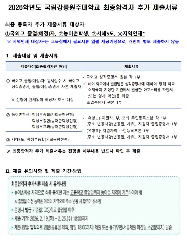 fnctId=bbs,fnctNo=1606 2026학년도 정시모집 최종합격자 추가 제출서류 안내 분류 정시모집 작성일 2026.02.04 작성자 박재원 조회수 1968 발송 주소지: [25457]강원특별자치도 강릉시 죽헌길 7 국립강릉원주대학교 입학과(대학본부C6, 1층 111호) 첨부파일 2026학년도 최종합격자 추가 제출서류.pdf