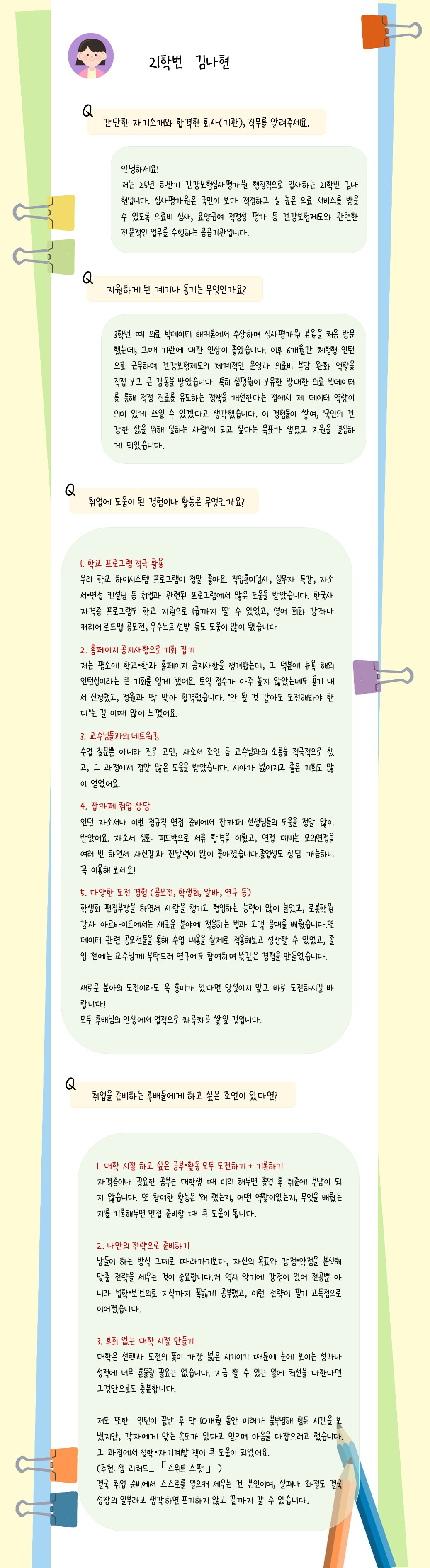 fnctId=bbs,fnctNo=242 [선배들의 취업 스토리] 21학번 김나현 졸업생 (건강보험심사평가원) 작성일 2025.12.11 작성자 데이터사이언스학과 조회수 416 “취업 고민하는 후배들을 위한 선배들의 진짜 조언” “취업 준비? 선배들의 경험담에서 답을 찾아보세요 :)” 첨부파일 첨부파일이(가) 없습니다.