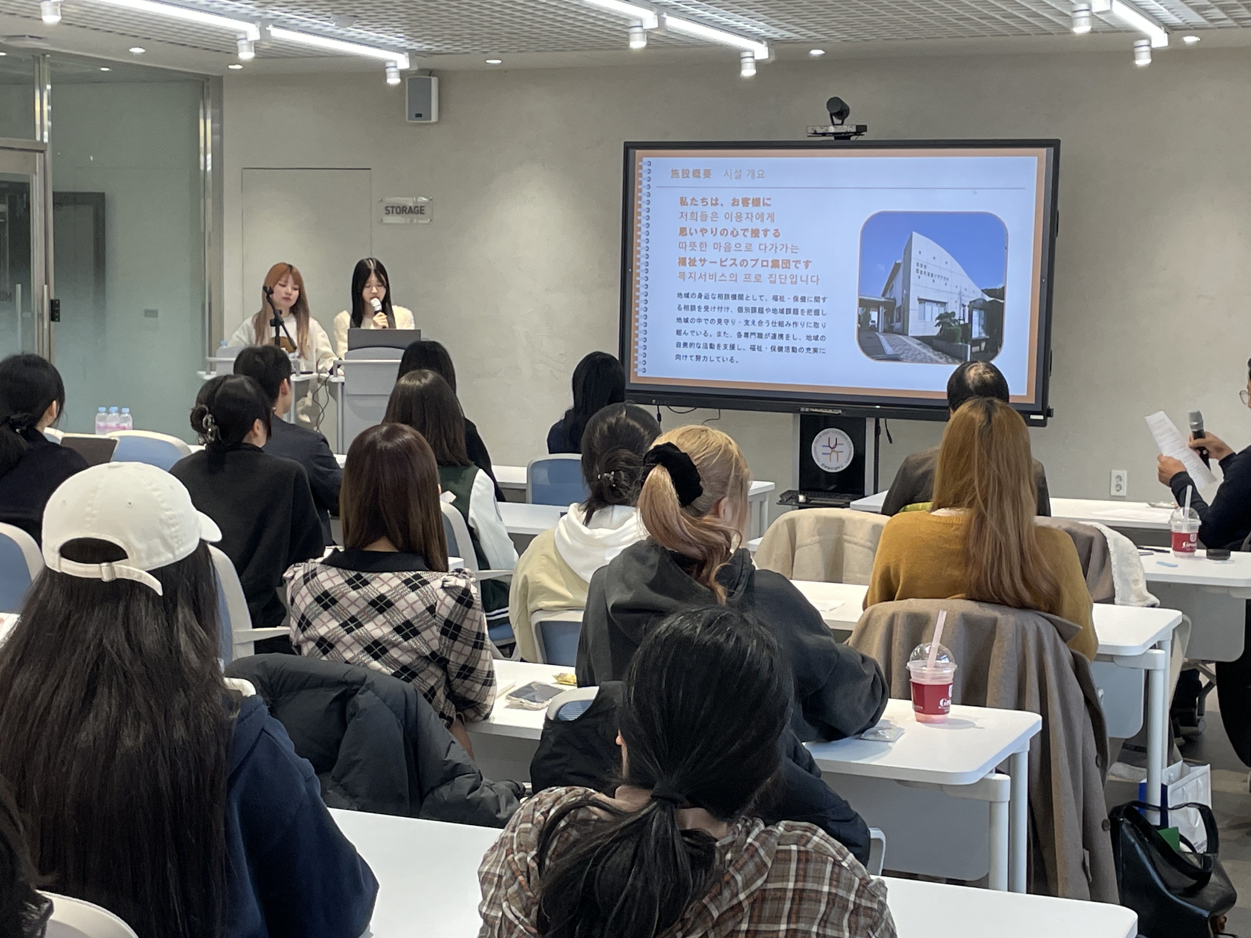 2부에서는 관동학원대학교 사회학부 학생들이 사회복지 실습 내용을 발표했으며, 이 과정에서 사회학부 정희성 교수가 동시통역을 맡았다. 이어 우리 대학 사회복지학과 학생들도 현장실습 발표를 진행했고, 동시통역은 이선영 교수가 담당했다.